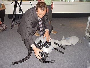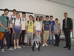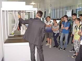 Außerdem wurde im FESTO-FORUM das Original-Modell des bionischen Greifarms gezeigt, der mittels Fin-Ray-Effekt in Form eines Elefantenrüssels alle möglichen Objekte und Dinge greifen kann – und der in Zukunft den typischen Robotergreifarm in Produktionsstätten ablösen könnte. Nach einem Gang über das Betriebsgelände hielt Herr Knubben einen ausführlichen Vortrag und informierte die Schüler auch im Gespräch über die Ziele, die Firmenphilosophie, deren Zusammenhang mit der Bionik, sowie der Firmengeschichte von FESTO. Gegen Ende des Gesprächs motivierte er die Schüler zur selbstständigen, kreativen Arbeit und versprach, sofern möglich, jederzeit Unterstützung – auch materieller Art.