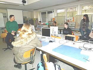 Im Physiklabor rauchten die Köpfe. Die Schüler berechneten gemeinsam mit Erich Matt den Quotienten aus der Energie, die in einem Gebäude für die Beheizung einer bestimmten Fläche benötigt wird und der Heizgradtagzahl. Aus dem Ergebnis lässt sich ablesen, ob ein Gebäude effektiv gedämmt ist. In einem zweiten Versuch hinterfragten die Gastschüler die Zukunftsfähigkeit der europäischen Länder angesichts des enormen Ressourcenverbrauchs. Sie analysierten das Längenwachstum eines Baumblattes in den verschiedenen europäischen Ländern. Hierbei zeigten sich Unterschiede in der Wachstumsgeschwindigkeit, aber es wurde deutlich, dass es in der Natur eine natürliche Wachstumsgrenze gibt. Übertragen auf die wirtschaftliche Entwicklung bedeutet dies, dass auch hier kein unbegrenztes Wachstum möglich ist und Europa nur zukunftsfähig ist, wenn ein Umdenken stattfindet.