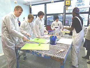 An zwei Tagen erarbeiteten die Schüler in verschiedenen Workshops Vorschläge zur Reduzierung des Energieverbrauchs in öffentlichen Gebäuden. In der Malerwerkstatt wurde unter der Anleitung von Werner Weber ausprobiert, wie sich durch unterschiedliche Farbanstriche die Lichtreflexion verändert und dadurch Energie eingespart werden kann.