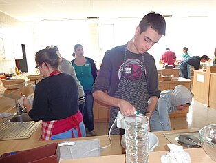 Nach einer kurzen Einführung in die Schulküche konnten die Schüler mit Hilfe der von den Fachlehrern zur Verfügung gestellten Rezeptmappen mit der Zubereitung der Speisen beginnen.