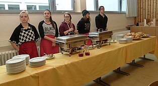 Für diesen Einsatz wurden sie mit einer erstklassigen Verpflegung belohnt. Gemeinsam mit ihren Fachlehrerinnen Margaretha Kleiser und Sigrid Neukum hatten die Schülerinnen und Schüler der 2 BFH 1 verschiedene Speisen vorbereitet. Ein leckerer Linseneintopf mit selbstgemachten Spätzle, eine Gemüsesuppe für die vegetarischen Spender, eine Kartoffelsuppe(ohne Schweinefleisch) sowie süßes und pikantes Gebäck kamen hervorragend bei allen Beteiligten an. Außerdem betreute die Klasse 2BFP 1 gemeinsam mit ihrer Lehrerin Alexandra Wagner die Spender bei der Anmeldung und sorgte so für einen reibungslosen Ablauf der Aktion.