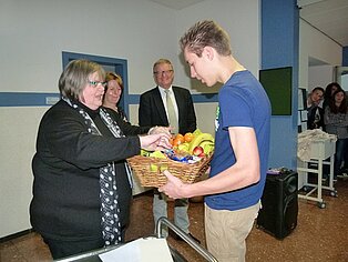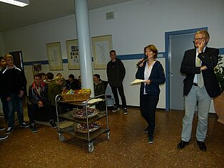 Die Vielfalt der Schule und das Miteinander im Schulalltag gestaltete die Eingangsklasse des Ernährungswissenschaftlichen Gymnasiums. In ihrem Exponat montierte sie Fotos von Schülern und Lehrern aus allen Bereichen der Schule und gruppierte die Bilder um das Schlagwort „WIR“. Dafür wurde die Klasse mit dem ersten Preis ausgezeichnet, der eine Einladung zum Essen in der Schulküche beinhaltet. Den zweiten Preis erhielt die Klasse VAB KF2 für ihr Kunstwerk. Die Schlagwörter aus dem Leitbild setzten die Schüler in den Farben des Schullogos mit Hilfe der textilen Molatechnik und das Schullogo mit der Chenilletechnik um. Als Belohnung für ihre Arbeit wird die Klasse zu Kaffee und Kuchen eingeladen. Ein Porträt von Bertha Benz schuf die Eingangsklasse IT des Technischen Gymnasiums. Im Hell-Dunkel-Kontrast gestalteten sie es mit Schlagwörtern aus dem Leitbild. Sie wurden dafür mit dem dritten Preis ausgezeichnet und bekamen einen großen Obstkorb zur Stärkung.