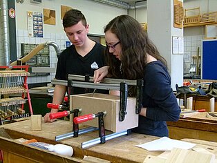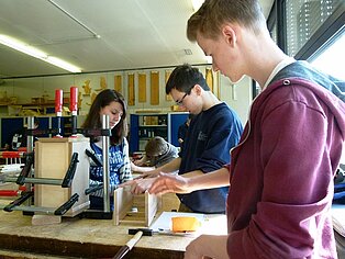 In der Holzwerkstatt, wo der der angenehme Duft des Holzes die Gäste empfing, stellten die Mädchen mit der Unterstützung ihrer Paten einen CD-Ständer her. Dabei mussten sie schleifen, bohren, leimen sowie Kanten brechen und runden und lernten somit wichtige Techniken der Holzbearbeitung kennen.