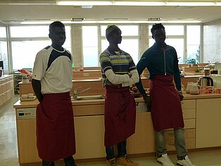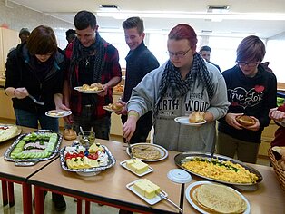 Am 26. November fand das lang ersehnte Frühstück und somit die erste interkulturelle Begegnung statt. Eine vorsichtige Annäherung, ein langsames Aufeinander zugehen; nach kurzer Zeit fielen die Schranken. Die Schülerinnen und Schüler näherten sich an - Kommunikation mit allen zur Verfügung stehenden Mitteln: auf Deutsch und Englisch, mit Mimik und Gestik. Die Schüler der Gastronomiegruppe hatten ein Frühstücksbuffet aufgebaut, das keine Wünsche offen ließ. Im Verlauf des Frühstücks bildeten die Schüler Gruppen und lernten sich besser kennen.