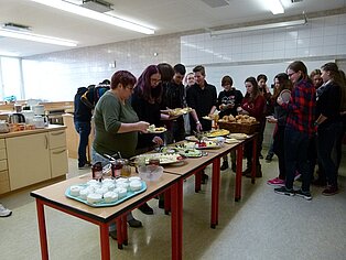 Im Bereich Gastronomie wurde in den vergangenen Wochen der Frühstücksservice eingeübt. Um die erlernten Fertigkeiten auch an realen Gästen erproben zu können, suchte die Fachlehrerin Margaretha Kleiser eine Klasse, die sich als Gäste zur Verfügung stellt. Die Bäckergruppe unter der Leitung von Günther Lutz unterstützte das Projekt durch die Herstellung von leckeren, frischen Brötchen.