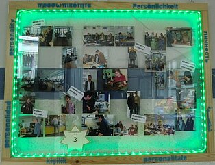Eine Fotocollage wurde von der Klasse EK TM gestaltet. Die LED Lichter stehen für die vielen Persönlichkeiten an der Schule und drücken den Zusammenhalt aus. Die Klasse wurde dafür mit dem dritten Preis ausgezeichnet und bekam von der Klasse VABKF2 selbst gebackene Muffins zur Stärkung. Alle Exponate können in einer Galerie im D-Gebäude bestaunt werden. Das Leitbildwettbewerbsteam bedankt sich bei allen Klassen für die Teilnahme und freut sich auf einen weiteren kreativen und lebendigen Leitbildwettbewerb im kommenden Schuljahr.