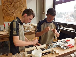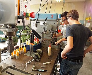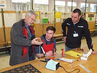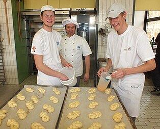 In den Werkstätten konnten die jungen Gäste selbst aktiv werden und die eigenen handwerklichen Fähigkeiten testen. Rechtzeitig vor Ostern gab es in der Farbabteilung einen Eierbecher, der mit der Unterstützung der Auszubildenden bemalt werde konnte. Der Umgang mit Holz ließ sich in der Schreinerwerkstatt beim Bau eines Schemels ausprobieren und in der Metallabteilung wurde eine große Büroklammer hergestellt, die zu Hause als Halter für Notizblätter dient. Außerdem wurde mit der CNC-Fräsmaschine ein Schlüsselanhänger in Form eines Baseballschlägers gefräst und gedreht.Wer seine Werkstücke nicht nach Hause mitnehmen, sondern gleich vor Ort genießen wollte, war bei den Bäckern genau richtig. Hier wurden Knotenbrötchen und Einstrangzöpfe gebacken.