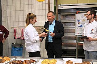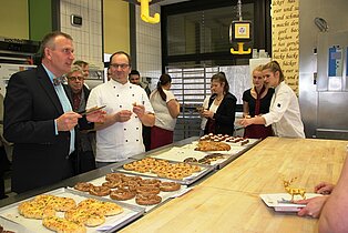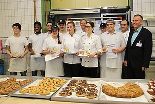 Gespannt erwarteten die Azubis die Preisverleihung, die von Schulleiter Christian Roth durchgeführt wurde. Er zeigte sich beeindruckt von den vielfältigen Gebäckkreationen, die die Lehrlinge in der Backstube präsentierten und freute sich selbst probieren zu dürfen und ein fachmännisches Urteil abzugeben, denn als gelernter Lebensmittelchemiker habe er darin Übung.