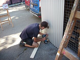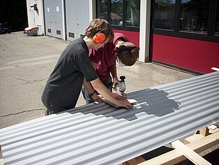 Schüler der 1BFB haben gemeinsam mit ihrem Fachlehrer Armin Sülzle das Gitterlager der Werkstätten mit Trapezblech verkleidet. Der stellvertretende Schulleiter Ottmar Frick freute sich über die neue Ausstattung des Materiallagers und bedankte sich im Namen der Schulleitung für das Engagement der Schüler.