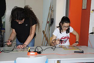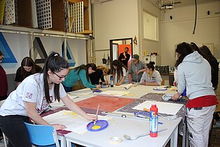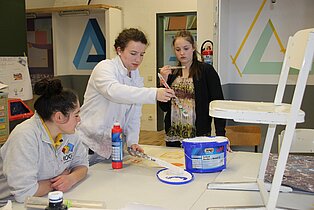 Am ersten Nachmittag wurde mit der Vorbereitung von Untergründen gestartet, indem sie geschliffen und mit Farbe beschichtet wurden. Anschließend durften die Mädchen Schablonenmuster auswählen und vergrößern und eine Schablone schneiden.