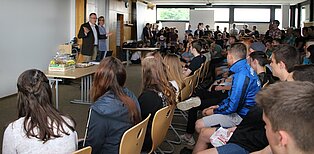 Schulleiter Christian Roth begrüßte die Schüler im großen Lehrerzimmer zur Preisverleihung. In Anlehnung an die Aussage des Bundespräsidenten, dass eine Gesellschaft mehr sei als ihre Gesetze, betonte er, dass eine Schule mehr sei als ihre Regeln. Deswegen sei der Leitbildwettbewerb eine tolle Aktion, bei der die Schüler ihre individuellen Fähigkeiten in ein Team einbringen und im Miteinander ein Werk schaffen, in dem sich der Geist der Schule zeige. Begeistert zeigte sich der Schulleiter auch darüber, dass sich die Vielfalt der Schule in der Teilnahme am Wettbewerb widerspiegelt, denn Klassen aus allen Bildungsgängen waren dabei. Sein besonderer Dank galt allen Kollegen, die die Aktion möglich gemacht hatten, insbesondere Julia Gerteis und Christine Majer, die die Fäden in der Hand hatten.
