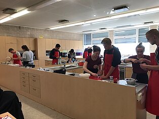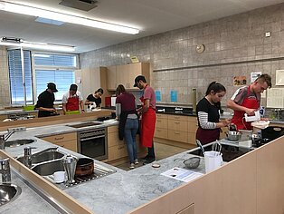 Im Fach Hauswirtschaft wurden Gruppen mit jeweils vier Personen in einer Küchenkoje gebildet. Jeder hatte einen Partner vom anderen Profilfach. Diese begleiteten sich über den ganzen Tag zur Hilfe. In der ersten Stunde wurden zusammen persönliche Hygiene, Arbeitsplatzhygiene, Rezepte und Arbeitsweise besprochen. Nachdem wir unseren Arbeits- und Zeitplan erstellt hatten, ging es los. Es wurde geschnitten, gehobelt, gehackt, gerührt und gebacken. Wir stellten zuerst ein Dessert „Schwarzwald-Becher“ her. Anschließend machten wir die Pizzabrötchen. Am Ende des vierstündigen Kochens aßen wir gemeinsam unsere gekochten Gerichte.