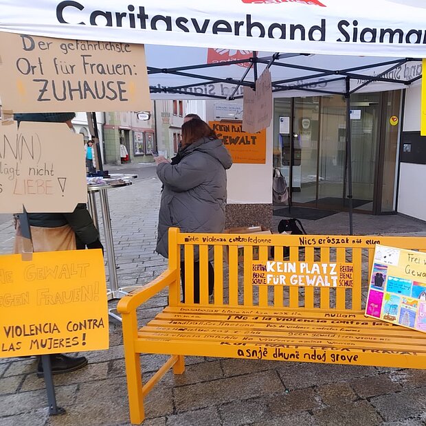 Die 2BFP1 hat gemeinsam mit der Schulsozialarbeiterin, Kathrin Römer, und ihrer Klassenlehrerin, Angela Schönebeck, eine Schulbank zur Aktion "Kein Platz für Gewalt" gestaltet und vergangenen Samstag auf dem Rathausplatz in Sigmaringen mit dem Caritasverband ausgestellt. Der Tag soll vor allem auf Gewalt gegen Frauen und Mädchen aufmerksam machen, da diese besonders häufig davon betroffen sind.