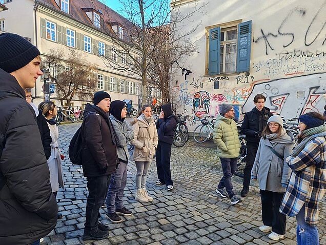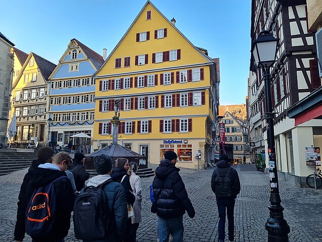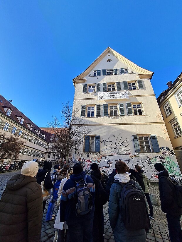 Anschließend führten zwei Studierende durch die Stadt und zeigten das lebendige studentische Leben in Tübingen. Die Gruppe tauchte ein in die Atmosphäre der Stadt und genoss die vielen Eindrücke wie etwa ein besetztes Haus mit dem Banner "Hier kotzte Goethe", das schöne Rathaus oder eine Kombination aus Studierendenwohnheim und Polizeiwache.