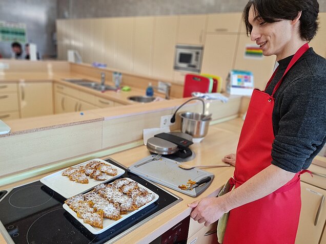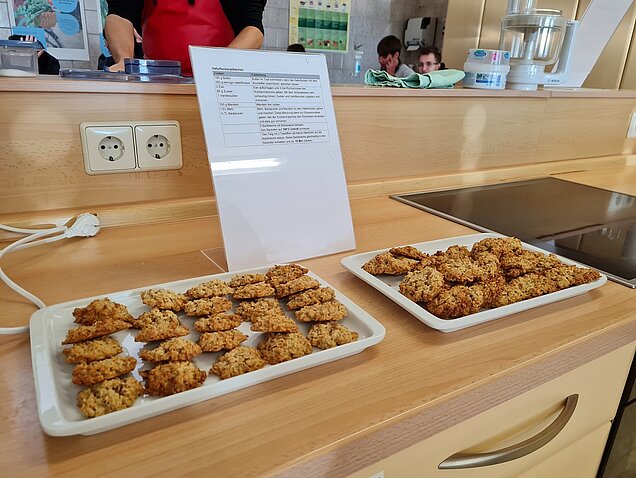 Der Workshop war in zwei Gruppen aufgeteilt. Die erste Gruppe bereitete einen leckeren Imbiss zu, bestehend aus Dinnetle, Pizzabroten, Karottenwaffeln und Haferflockenplätzchen. Die zweite Gruppe zauberte ein köstliches Mittagessen mit Fischfilet, Hackfleischbällchen und Käsespätzle mit Salat.