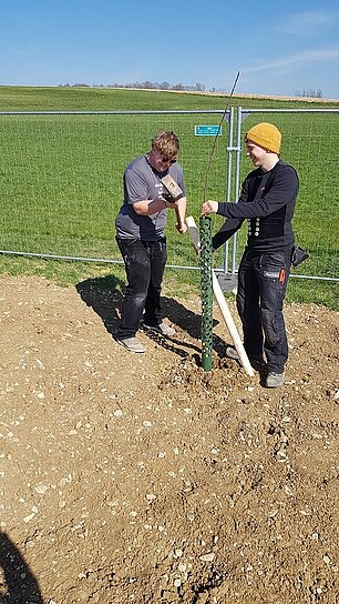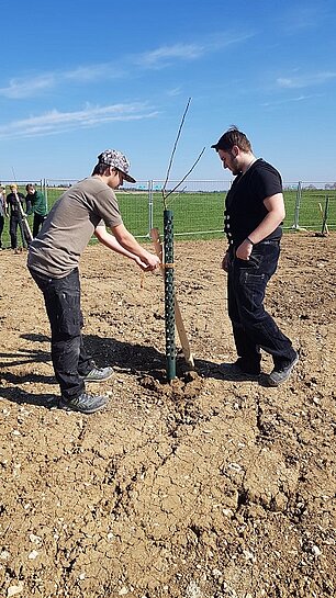 Schüler der 1BFB haben auf dem neuen Schulgelände 27 Obstbäume gepflanzt. Bei strahlendem Frühlingswetter hatten die Schüler Spaß und als Belohnung gab es ein zünftiges Vesper an der Schule. Gestiftet wurden die Bäume von Schulleiter Ottmar Frick. So nimmt nicht nur der Neubau immer mehr Gestalt an, sondern auch das gesamte Gelände.