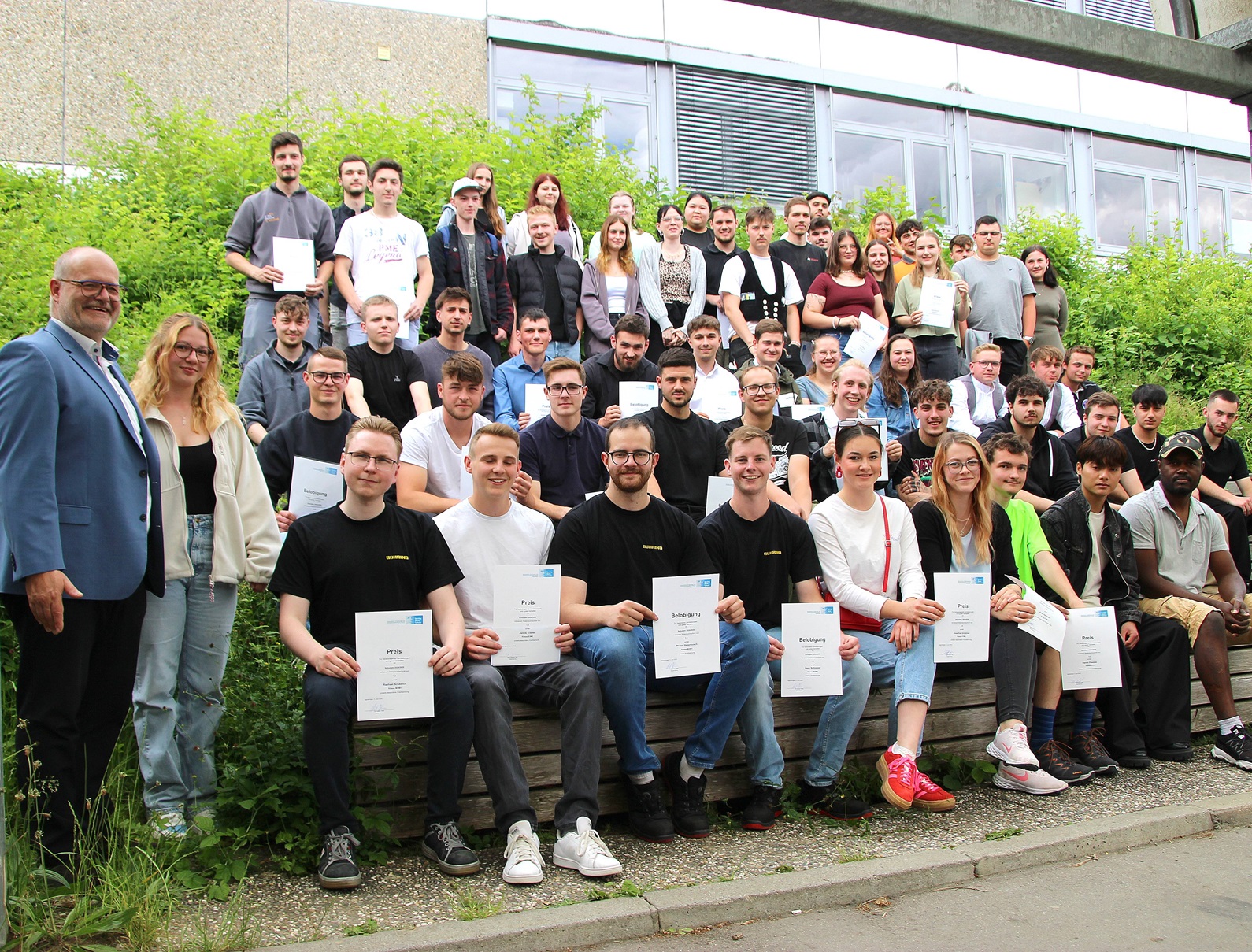 66 Schüler*innen der Bertha-Benz-Schule haben bei der Sommerabschlussprüfung den schulischen Teil ihrer Berufsausbildung in der Bau-, Holz-, KFZ-, Elektro- und Metalltechnik sowie in der Ernährungsabteilung erfolgreich abgeschlossen. 17 Auszubildende wurden für ihre Leistung mit einer Belobigung ausgezeichnet und 15 erhielten einen Preis. Die Traumnote 1,0 erzielte der Tischler Daniel Prestle, der dafür den Preis der Landrätin für die beste Leistung aller Auszubildenden überreicht bekam.