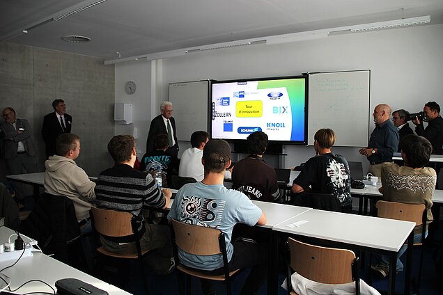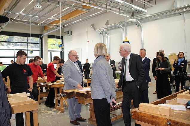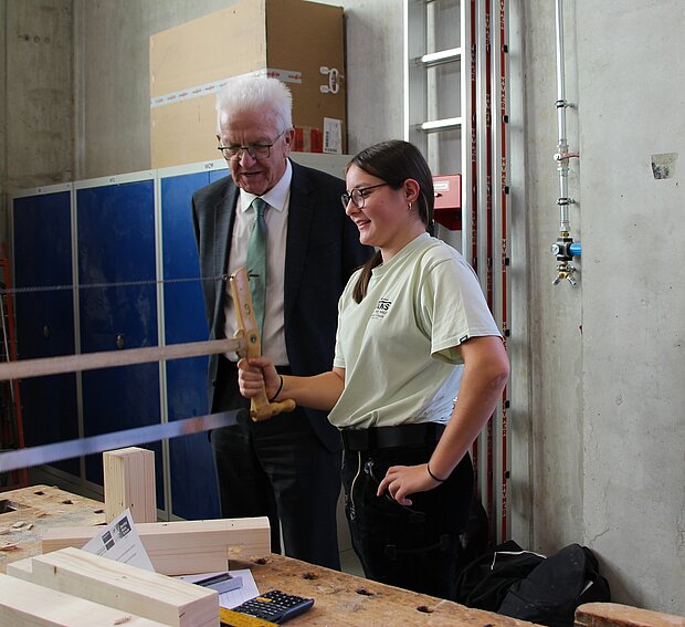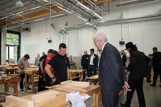 Bei der Bauklasse der einjährigen Berufsfachschule und im Seminarkurs des Technischen Gymnasiums hatte Kretschmann am Freitagnachmittag noch die Gelegenheit mit Schülerinnen und Schülern ins Gespräch zu kommen und ein paar Einblicke in den Unterricht in bestens ausgestatteten Werkstätten und Klassenzimmern zu bekommen.