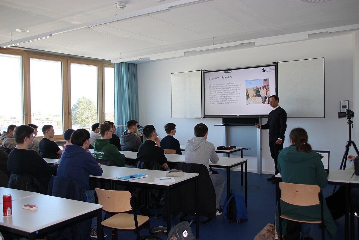 Wie eine solche Kooperation konkret aussehen kann, zeigte vor Kurzem ein Besuch an der Bertha-Benz-Schule in Sigmaringen. Im Wahlfach „Sondergebiete der Technik“ der Jahrgangsstufe 1 von Urban Eschbach stellten Prof. Reg.-Bm. Lorenz Bock und Elke Konday den Studiengang Smart Building Engineering and Management vor. Neben Einblicken in nachhaltige Gebäudeplanung, Energieeffizienz und Wirtschaftlichkeitsberechnungen konnten die Schülerinnen und Schüler selbst aktiv werden: Sie maßen das Raumvolumen ihres Klassenzimmers mit einem Lasermessgerät, testeten eine Thermografiekamera und lernten die Funktionsweise einer Wärmepumpe kennen. Das große Interesse und die engagierte Mitarbeit unterstrichen den Mehrwert solcher direkten Einblicke.