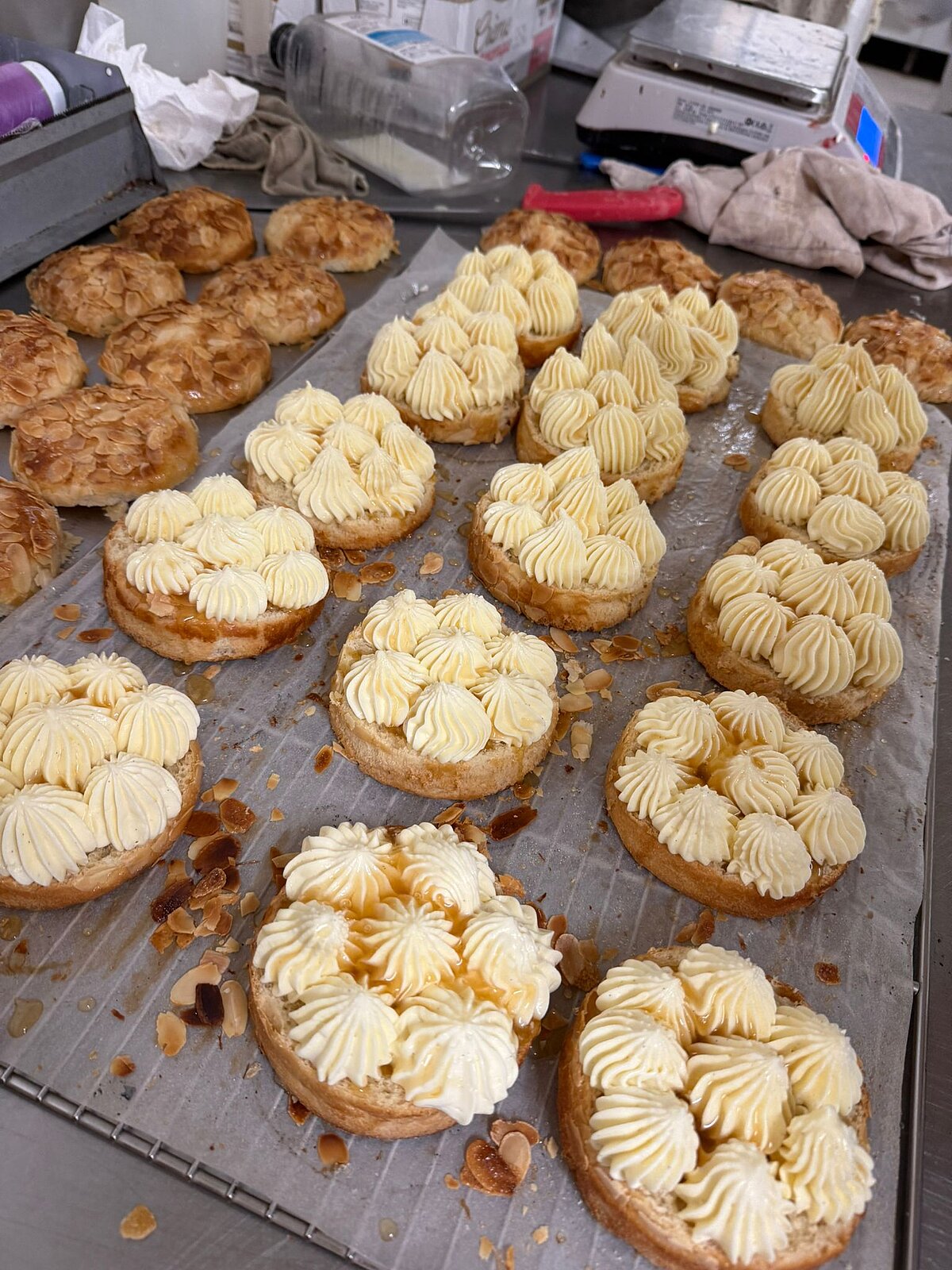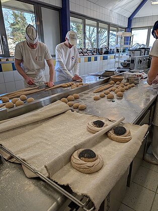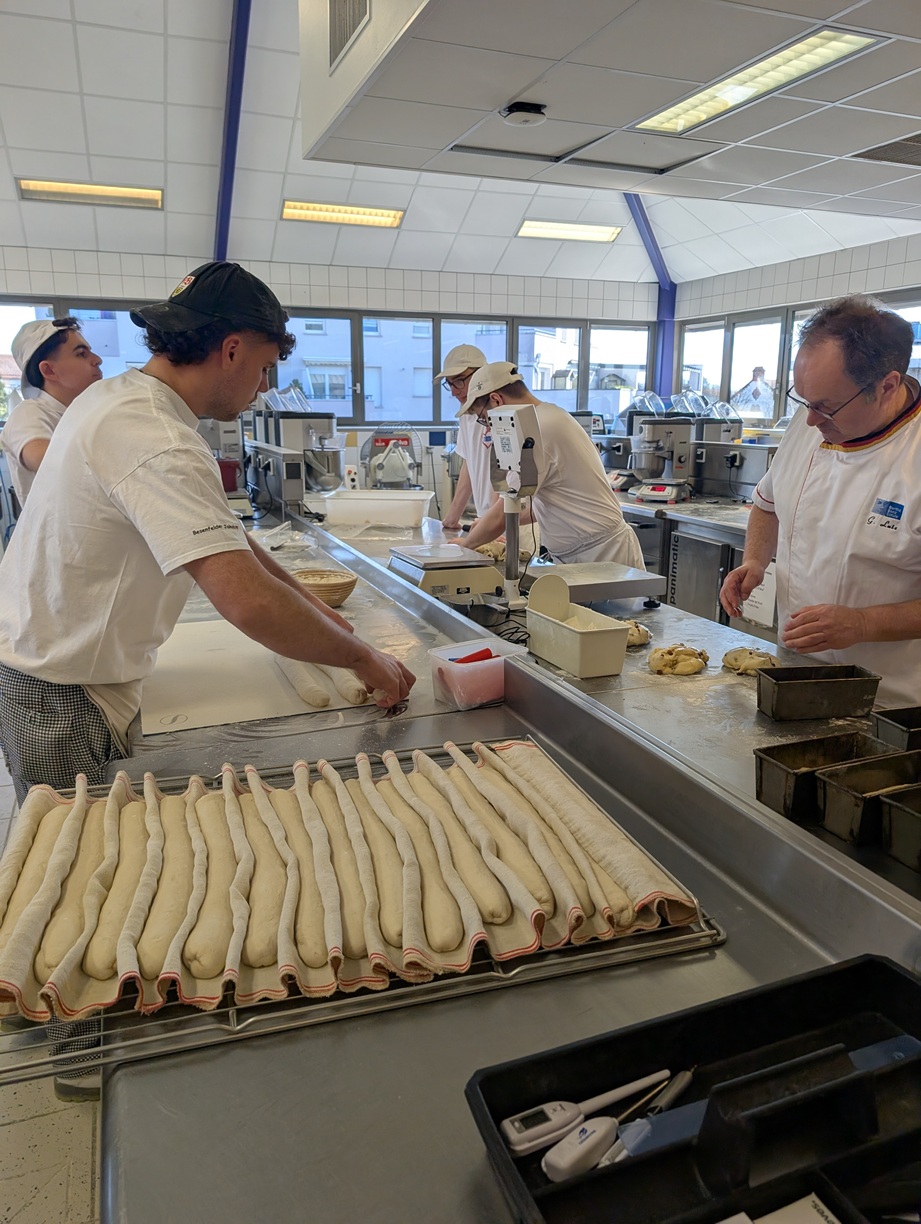 Zu Beginn der Woche nahm die Klasse am fachpraktischen Unterricht der Partnerschule teil, wo sie neben Klassikern wie Croissants, Pains de Chocolat und traditionellem Baguette auch typische Gebäcke wie Rosenkuchen, kunstvoll verzierte Vollkornbrote, Kougelhopf, Beignets, Pain d’Épis, Ropfkuche, Gateau Cannelle und Crémantaise zubereiteten. Die Auszubildenden und Lehrkräfte vor Ort empfingen die Klasse sehr herzlich und gaben sich viel Mühe, auf Elsässisch, Deutsch oder Französisch miteinander zu kommunizieren und so konnten auch neue Bekanntschaften geschlossen werden.
