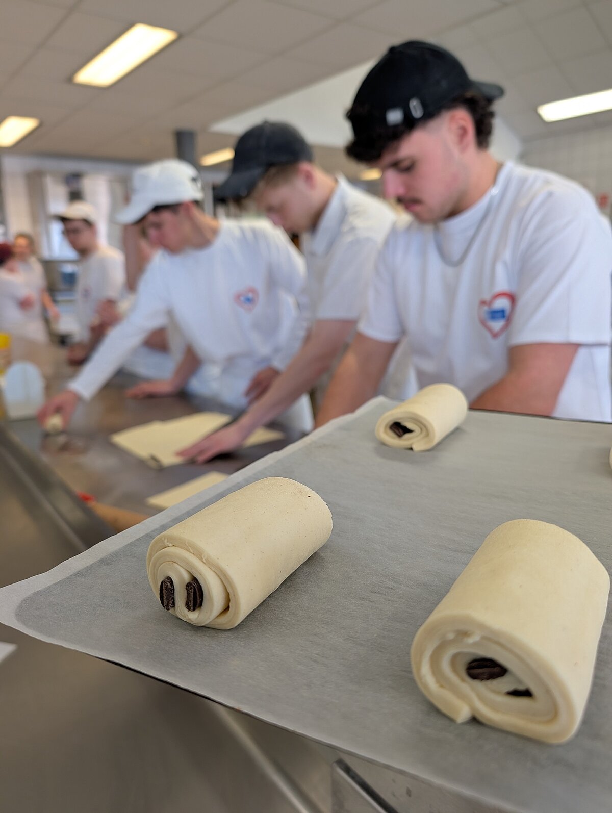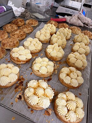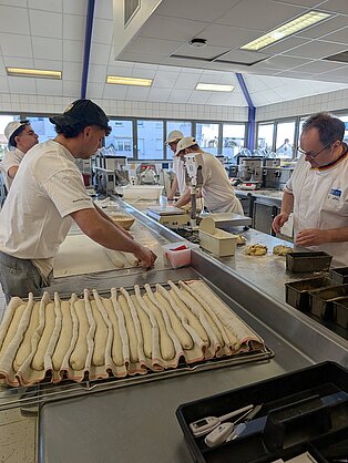 Von Mittwoch bis Freitag absolvierten die Auszubildenden Tagespraktika in den Bäckereien Gautherot, Dürrenberger und Parré in Haguenau und Umgebung. Die Bäckereien freuten sich auf die erfahrenen Lehrlinge und es gaben sich alle Mühe, die sprachlichen Differenzen zu überbrücken. Während des Praktikums war das fachliche Können der Schülerin und der Schüler gefragt, aber sie lernten auch neue Techniken und Rezepte kennen. Besonders in Erinnerung blieb ihnen auch, dass sie an einem Tag bis zu 1500 Croissants aufrollen mussten oder an einem Tag über 300kg Teig für ca. 1000 Baguette vorbereitet wurden. Auch Einblicke in die sehr filigrane Konditoreikunst begeisterten so manchen Jugendlichen.