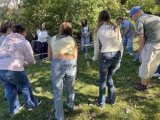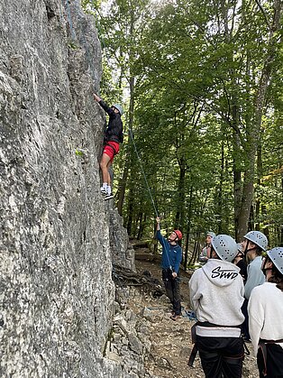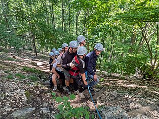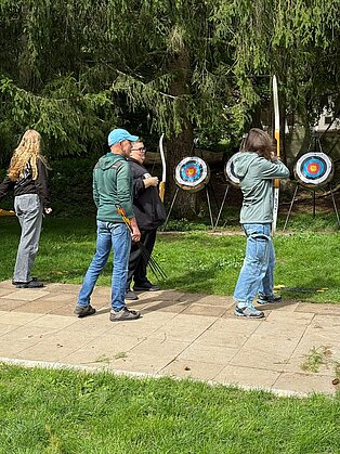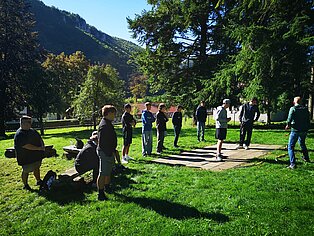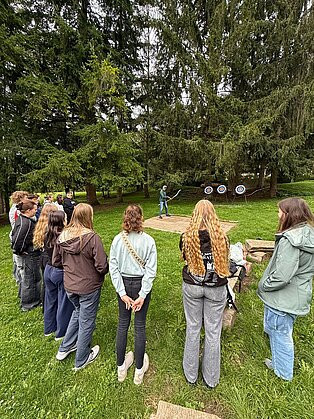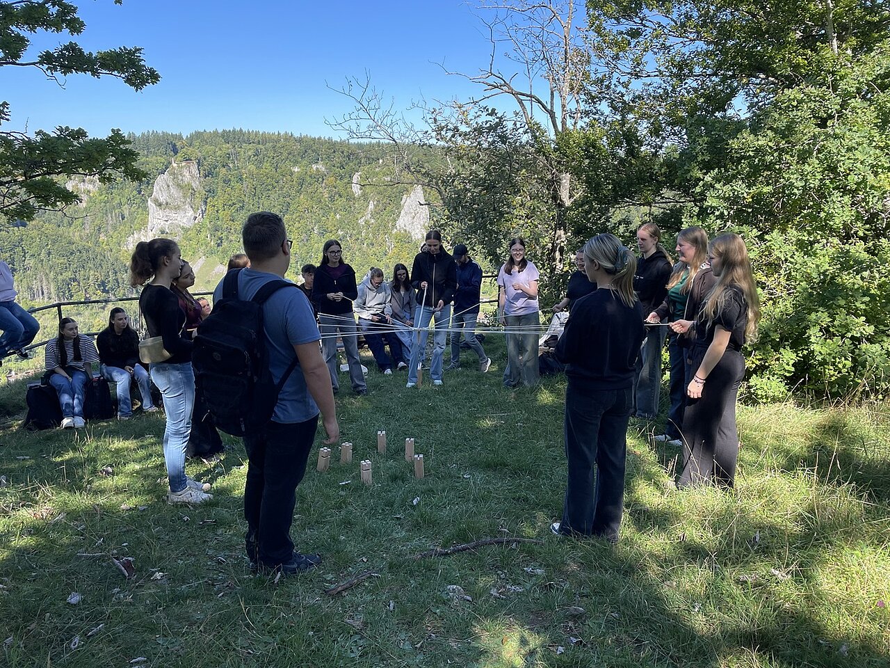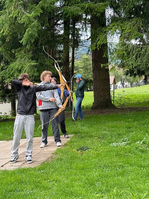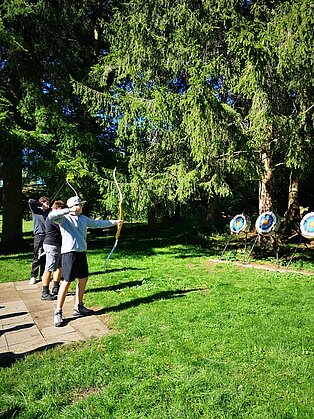 Bei verschiedenen Aktivitäten ausgehend von der Unterkunft „Murmeltier“ in Hausen im Tal lernten sich die Schüler*innen schnell kennen. Vertrauen in sich selbst und vor allem auch in die Mitschüler*innen an der Seilsicherung war beim Klettern am Verlobungsfelsen gefragt. Beim Bogenschießen stand die Konzentration im Vordergrund und beim Geocaching mussten die Gruppen ausgestattet mit Kompass und GPS-Gerät den Weg zum versteckten „Schatz“ finden.
