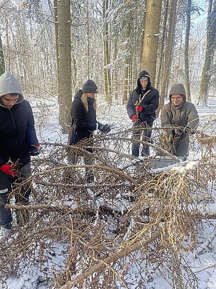 Schülerinnen und Schüler des AVdual besuchten gemeinsam mit dem Beratungslehrer Florian Bischofberger, ihren Lehrkräften Diana Müller und Thomas Stahnke sowie ihrer AVdual-Beraterin Melanie Eichelsmann die Waldschule Wunderfitz in Laiz. Dort gestaltete Försterin Nina gemeinsam mit der Klasse einen spannenden Tag bei winterlichen Bedingungen.