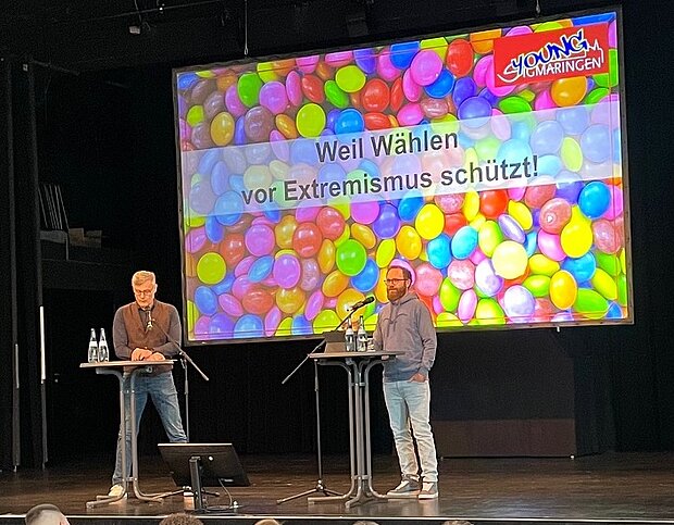 In der vollbesetzten Stadthalle war gleich zu spüren, dass es dem Bürgermeister ein wichtiges Anliegen war, mit den Jugendlichen direkt ins Gespräch zu kommen und sie zur Teilnahme an den Wahlen zu motivieren. Gemeinsam mit Gemeinschaftskundelehrer Berens vom Hohenzollerngymnasium informierte er über den Aufbau und die Zuständigkeiten des Gemeinderats und über die Modalitäten der Kommunalwahl, um dann schnell zur wesentlichen Grundfrage zu kommen: „Warum wählen gehen?“ Ehm betonte, wie wichtig und entscheidend gerade bei den Kommunalwahlen jede Stimme ist. Wer wählen gehe, übernehme mit seiner Stimmabgabe Verantwortung, wer dagegen lieber zu Hause bleibe, überlasse die Entscheidung anderen. Vor allem sei die Wahl gerade in politisch angespannten Zeiten ein wichtiger Schutz gegen Extremismus.