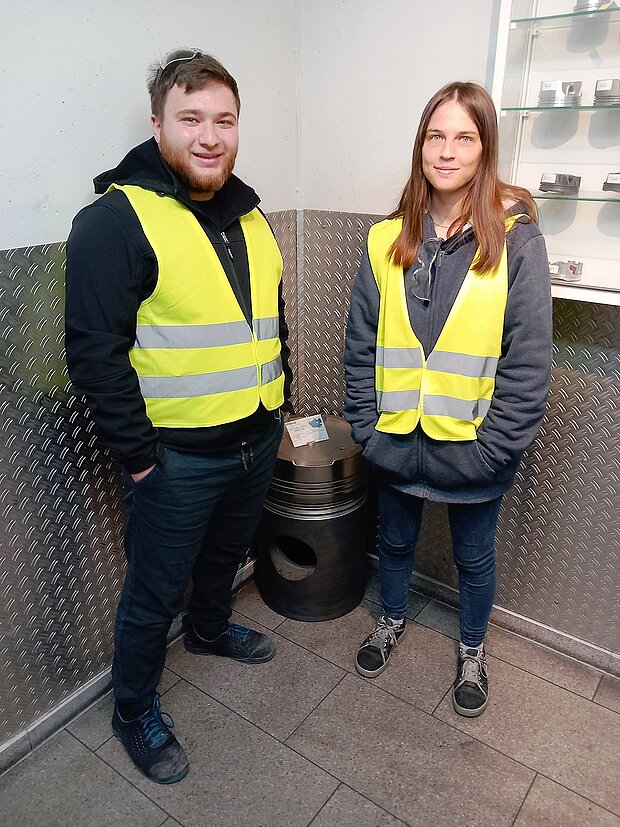 Ausgestattet mit persönlicher Schutzkleidung (Sicherheitsschuhe, Warnweste und Sicherheitsbrille) und nach einer Sicherheitsunterweisung wurden die Schüler/innen dann in kleinen Gruppen von Auszubildenden durch die Ausbildungswerkstatt und die Produktion geführt und bekamen so einen guten Einblick in die verschiedenen Abteilungen – von der Gießerei über die Schmiede bis zur Fertigung Aluminium – sowie die verschiedenen, teilweise hochautomatisierten Arbeitsschritte bis hin zum fertigen Kolben.