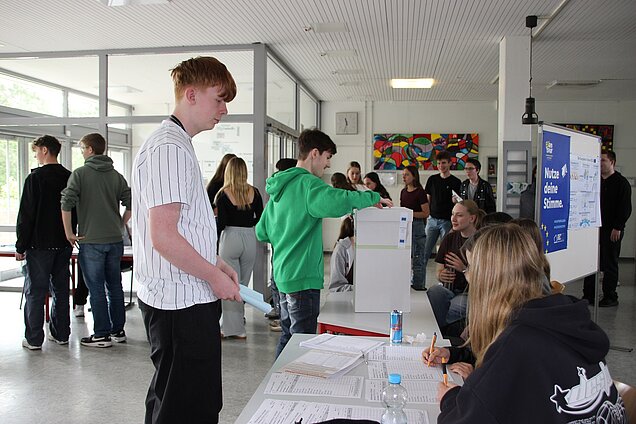 Im beruflichen Gymnasium der Bertha-Benz-Schule waren 326 Schülerinnen und Schüler aufgerufen, ihre Stimme bei der Juniorwahl abzugeben. Im Vorfeld der Wahl wurden die wichtigen Informationen zum Wahlsystem und zu den Themen der Wahl und den Positionen der Parteien im Unterricht behandelt. Am Wahltag konnten die Schülerinnen und Schüler mit den Wahlbenachrichtigungen, die sie im Vorfeld erhalten hatten, auf einem originalgetreuen Stimmzettel ihre Stimme zur Europawahl im mit Wahlkabinen und Wahlurne ausgestatteten Wahlraum abgeben. Für einen reibungslosen Ablauf der Wahl sorgten die zuverlässigen Wahlhelferinnen und Wahlhelfer der EK SG1 unterstützt durch GGK-Lehrerin Sarah Honeck.