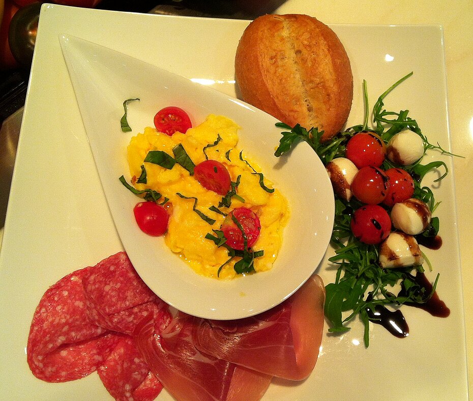 Das Belegen und Garnieren von Snacks, die Zubereitung von Frühstückstellern und kleinen Speisen gehören zu den täglichen Aufgaben.