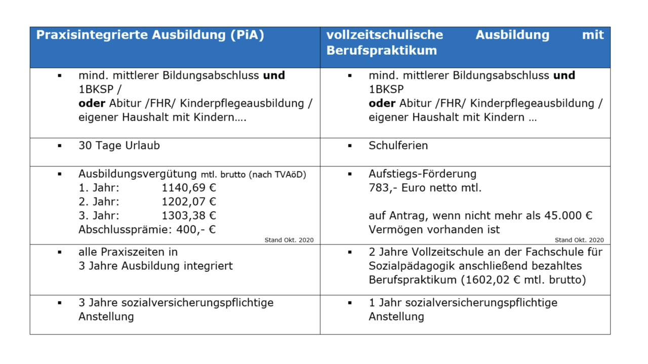Praxisintegrierte Ausbildung (3 Jahre) an der Fachschule für Sozialpädagogik (PIA)
