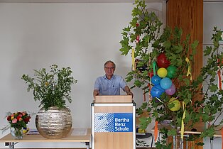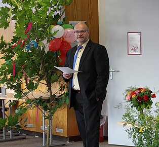 Abteilungsleiter Peter Schnurr befasste sich in seiner Ansprache mit den Besonderheiten der Vorbereitungsphase für das Abitur, die während des Shutdowns stattgefunden hat. Bei der Beurteilung dieser Situation gingen die Meinungen auseinander. Einige betonten, dass es noch nie Abiturienten gegeben habe, die so viel Zeit hatten, um sich auf die Prüfungen vorzubereiten. Andere stellten in den Vordergrund, dass die Prüflinge in dieser Phase hauptsächlich auf sich alleine gestellt waren und mehr Betreuung gebraucht hätten. Schnurr stellte fest, dass die Schülerinnen und Schüler hierbei schon mal ihre Reife, die ihnen im Abiturzeugnis bescheinigt wird, unter Beweis stellen mussten. Beim einen oder anderen sei da noch etwas Luft nach oben, was die Zuverlässigkeit in der digitalen Kommunikation betrifft. „Feiern Sie mit Abstand und mit Anstand.“ forderte Peter Schnurr die Abiturienten auf.