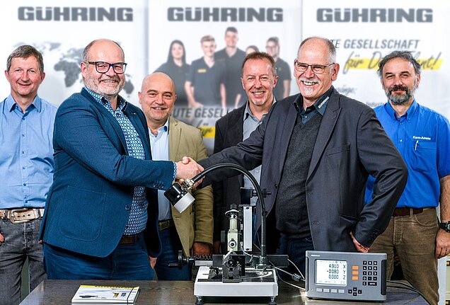Der stellvertretende Schulleiter Ottmar Frick bedankte sich bei der Übergabe des Messgerätes bei Günter Hartmann und Roland Boos, den Leitern der technischen Ausbildung in Albstadt und Laiz für die Unterstützung der Firma. Nur in enger Kooperation zwischen der Schule und den Betrieben sei die fachliche Ausbildung der Azubis auf hohem Niveau möglich, betonte Frick. Günter Hartmann bestätigte, wie wichtig es ist, dass alle an einem Strang ziehen, um die Qualität der Ausbildung zu gewährleisten, die der Garant für den Erfolg eines Betriebes sei. Vor allem die eigene Ausbildung von Facharbeitern sichere die Zukunft von Unternehmen. Für die jungen Menschen der Region bieten Global Player wie Gühring Berufs- und Karrierechancen in der Region, aber auch weltweite Einsatzmöglichkeiten an den verschiedenen Standorten des Unternehmens. „Wir müssen den jungen Menschen zeigen, dass wir hier Schätze an Firmen in der Region haben, die hervorragende Zukunftschancen bieten“, so Hartmann.