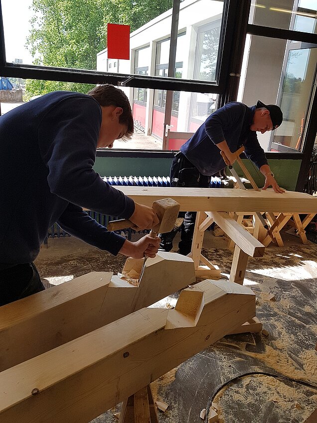 Motiviert durch die Aussicht ein bleibendes Werk zu schaffen, gingen die angehenden Zimmerleute im Unterricht, unterstützt durch ihren Fachlehrer Armin Sülzle, an die Planung. Zunächst musste Aufmaß, Abbundplan und eine Materialliste erstellt werden. Die Hauptarbeit in der schuleigenen Werkstatt bestand im Abbinden des Holzes.