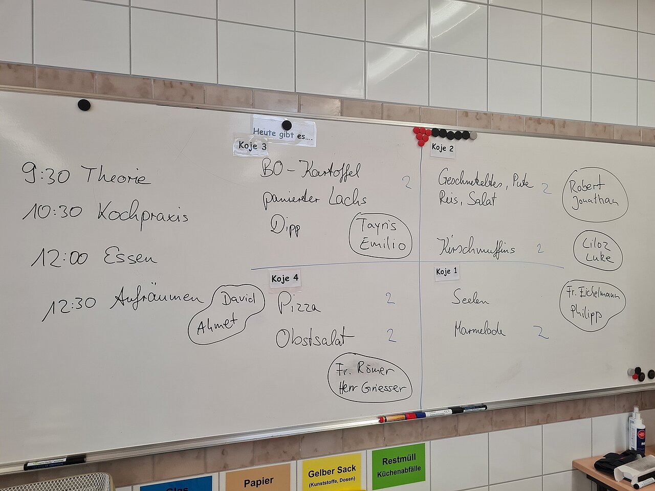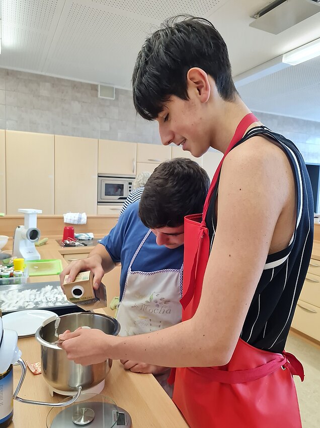 Woran erkennt man gesunde und weniger gesunde Lebensmittel? Wie sieht eine ausgewogene Mahlzeit aus und wie viel Zucker steckt in unseren täglichen Lebensmitteln? Diese Fragen wurden in einem Theorie-Input vorab geklärt und eine Einführung in die Benutzung der Küche gegeben. Dann gab es in den vier Kochkojen viel zu tun: Es wurden drei Gerichte mit Beilagen vorbereitet, von Lachs über Putengeschnetzeltes und vegetarischer Pizza war für jeden Geschmack was dabei. Das Zubereiten des Nachtischs, Obstsalat und Seelen mit selbstgemachter Marmelade, machte ebenfalls viel Spaß. Auch die Begleitpersonen, bestehend aus Schulsozialarbeiterin Frau Römer, Avdual-Begleiterin Frau Eichelmann und der Lehrkraft Herr Griesser, wurden nicht geschont und durften bei der Speisenzubereitung mitanpacken. Das Timing passte trotz der großen Zahl ungeübter Köchinnen und Köche auf Grund von Frau Kellers Expertise so perfekt, dass um Punkt 12 Uhr alles dampfend angerichtet war.