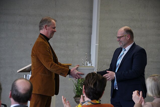 Viel Dank und Anerkennung sprachen Stefanie Bürkle und Dr. Susanne Pacher Christian Roth aus. 2016 hatte er mit zukunftsweisenden Ideen die Leitung der Schule übernommen und diese mit viel Engagement geführt, bis er durch eine schwere Erkrankung ausgebremst wurde. Für seine mutige Entscheidung, sich aus gesundheitlichen Gründen aus dem Amt als Schulleiter zurückzuziehen und wieder als Lehrer zu arbeiten, zollten ihm die Landrätin und die Abteilungspräsidentin großen Respekt.