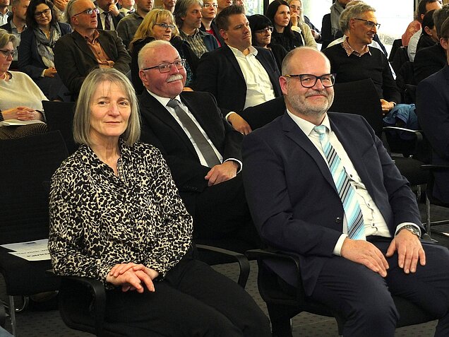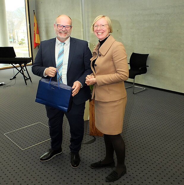 „Der Staffelstab wird weitergegeben in der größten Schule des Landkreises“, stellte Stefanie Bürkle in ihrer Ansprache fest. Zuversichtlich blickt sie dabei in die Zukunft der Zusammenarbeit zwischen Schule und Schulträger, denn Ottmar Frick habe sich bereits als stellvertretender Schulleiter in herausfordernden Zeiten als „unschätzbar wertvoller Partner“ für den Schulträger erwiesen. „Sie waren und sind ein Glücksfall für die Schule“, stellte die Landrätin mit Überzeugung fest, weil Frick ruhig, souverän und belastbar sei, aber auch immer humorvoll und einfach das Herz am richtigen Fleck habe. Deshalb ist Stefanie Bürkle auch überzeugt davon, dass mit dem Neubau der Bertha-Benz-Schule eine tolle Schule entsteht, denn hier hat Frick gemeinsam mit dem Kollegium schon unzählige Stunden in die Planung einer Schule investiert, die nicht am Reißbrett entsteht, sondern in enger Abstimmung mit den Beteiligten des Schullebens, die wissen, worauf es in der Praxis ankommt.